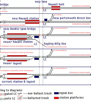 A diagram showing the layout changes of Havant station, with level crossings labelled as LC