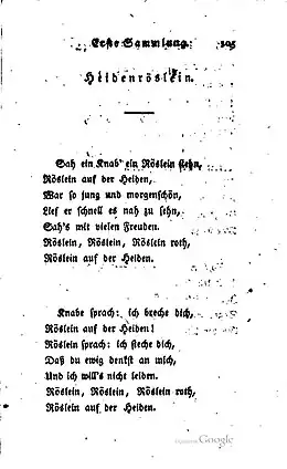 - ↑ Goethe, Johann Wolfgang von (1789). "Heidenröslein". Goethe's Schriften. Vol. 8. Leipzig: Georg Joachim Göschen. pp. 105–106.