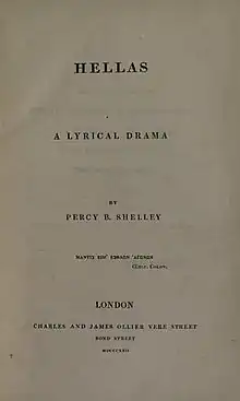 Hellas is a verse drama by Percy Bysshe Shelley, written in 1821 and published in 1822 by Charles and James Ollier in London. Shelley wrote it while living in Pisa, with a view to raising money for the Greek War of Independence. It was to be Shelley's last published poem during his lifetime.[1]
