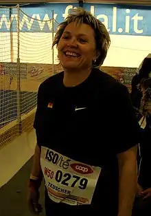 As a veteran Helma Knorscheidt (now married Teuscher) is active as well. She took part at several World Masters Athletics Championships and European Veterans Athletics Championships. She was most successful by winning the shot put competition age group W50 at World Championships 2007 in Riccione (Italy) (14,40 m using 3 kg shot)[1] and gaining the world record in same age group at European Championship 2008 in Ljubljana (result 14,94 m)[2](excelled in 2009 by Alexandra Marghieva)[3]