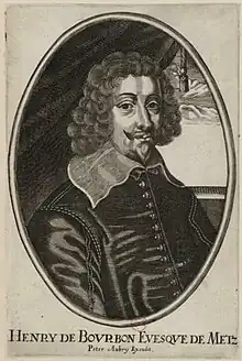 Gaston Henri de Bourbon, Duke of Verneuil (3 November 1601 – 28 May 1682), was the bishop of Metz from 1612 to 1652, despite not being ordained. In his early 50s he was displaced and had a career as a diplomat.