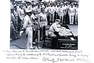 A handwritten inscription on photograph of Admiral Chester Nimitz signing the Japanese surrender document reads, "To Rear Admiral H. Arnold Karo, USC&GS -- with best wishes and great appreciation of the assistance of the U.S. Coast and Geodetic Survey in making possible the above scene." C.W. Nimitz, Fleet Admiral, U.S. Navy.
