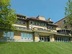 The 31⁄2-story house is composed of cream-colored brick in a combination of the Spanish revival and Mission revival styles. It sits high on the bluff on spacious, terraced grounds. The house remains largely intact even though the east side has been modified somewhat to connect to the main nursing home building.[13] There is a Porte-cochère on the north side of the house, and tall end chimneys with decorative concrete caps at several different locations. Other decorative elements on the houses exterior include Baroque ornamentation surrounding oval windows; a balustraded piazza; and superimposed loggia with columns distyle-in-antis. The entire structure is capped with multiple hipped roofs covered in red ceramic tiles.
