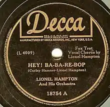"Hey! Ba-Ba-Re-Bop" is a 1946 song by Lionel Hampton and His Orchestra. The song's lead vocals were performed by Lionel Hampton himself and the recording featured Herbie Fields on alto sax. The song went to number one on the R&B Juke Box chart for sixteen non-consecutive weeks and reached number nine on the national pop charts.[1]