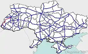 Main route and connections to/intersections with other highways in Ukraine.[2]