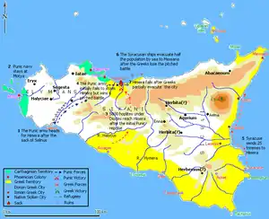 The magnitude of the armament sent under Hamilcar, who is said to have landed in Sicily with an army of 300,000 men, sufficiently proves that the conquest of Himera was the pretext, rather than the object, of the war. However, it is likely that the growing power of Himeria in the immediate vicinity of the Carthaginian settlements of Panormus and Solus had already caused concern among the Carthaginians. Hence it was against Himera that the first efforts of Hamilcar were directed. Theron, who had thrown himself into the city with all the forces at his command, was able to maintain its defence until the arrival of Gelon of Syracuse. Despite the numerical inferiority of his forces, he defeated the army of the Carthaginians with such slaughter that the Battle of Himera in 480 BC was regarded by the Greeks of Sicily as worthy of comparison with the contemporary victory of Salamis.[6] The same feeling probably gave rise to the tradition or belief, that both triumphs were achieved on the very same day.[7]