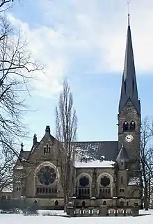 The Himmelfahrtskirche (German pronunciation: [ˈhɪml̩faːɐ̯tsˌkɪʁçə]; Church of the Ascension) is a Protestant church in the Leuben district of Dresden. It was designed by Karl Emil Scherz and completed in 1901, replacing the Alte Kirche.[1] It is a listed monument.
