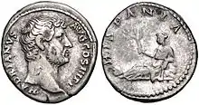 Hadrian made frequent trips to many provinces of the Empire, and to commemorate these trips in a propagandistic way, coins relating to these trips were minted by each province. One of them corresponds to Hadrian's trip to Hispania. The most famous allegory of Hispania was coined in Rome; it was a female figure with a long tunic, stamped with laurel or olive, reclining to the left, with her left arm on some rocks, which could refer to the Pyrenees. With his right hand he holds an olive branch. At the feet of the figure appears a rabbit, the animal that the Phoenicians theoretically used to name the peninsula: Hishphanim.