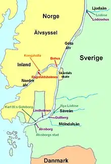 When the Kingdoms of Denmark, Norway and Sweden came into being in the late Viking Age, it appears that the entire western coastline of Scandinavia was claimed by Norway and Denmark, with the Göta Älv marking the frontier between the two kingdoms. However, during the High Middle Ages the Swedes seem to have conquered or otherwise taken control of a sliver of land on the south bank of the Göta Älv, as well as a foothold on the southern side of Hisingen island, and thereby secured access to the North Sea for the first time. It is not clear exactly when this territorial acquisition occurred, but it was probably in the mid-thirteenth century.[4][5]