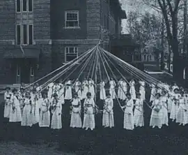 Women of Ohio in the early 1900s performing a Maypole dance as a rite of Spring on the College Green.