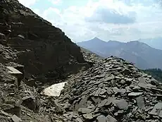 1908 saw a rich crop of publications as Walcott worked on the material he had collected the previous year, and towards the end of August 1909 he returned to the Field area. That summer, Walcott had visited England to participate in the celebration of Darwin's centenary. Whilst there, he had met the Natural History Museum curator Henry Woodward, who had suggested that the nearby Mount Field may yield further fossils of the ilk of the Trilobite beds.[2] Promptly upon his arrival in Field, Walcott ascended the slopes of Mount Field via Burgess Pass. This pass, probably one of the many constructed by the CPR in an effort to attract tourists,[6] led along what is now called Fossil Ridge. Walcott recognised the talus material which lay across the trail as the Stephen Formation, and noticed interesting fossils. This find is often considered to be the first discovery of the Burgess Shale 'proper'.[7] He spent several more days collecting on Fossil Ridge before returning to Mount Stephen to bolster his collections from the Trilobite Beds.[5]