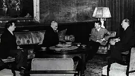 In addition, Reza Shah sympathized with Nazi Germany, making the Jewish community fearful of possible persecutions, and the public sentiment at the time was definitely anti-Jewish[63][64] There were many rumors in Iran that Hitler secretly had converted to Islam and had taken the name Heydar (the title of Imam Ali). The rumors stated that Hitler had a necklace depicting the picture of Imam Ali and was planning to reveal his true religion after defeating the deceitful British, the godless Russians and the Jews. A popular folk poem at the time said: "Imam is our supporter, Hossein is our master. If Germany doesn't arrive, dirt on our heads."[66]