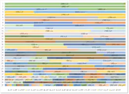 Distribution of sūrah across ajzāʼ, with the length of the bar corresponding to a sūrah being proportionate to the number of letters of the sūrah in the juzʼ divided by the total number of letters in the juzʼ.