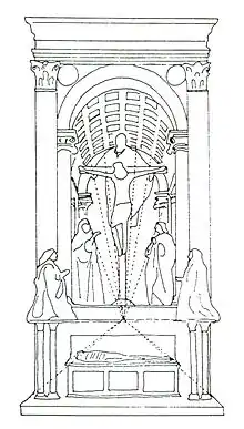 The Trinity is noteworthy for its inspiration taken from ancient Roman triumphal arches and the strict adherence to recently developed perspective techniques, with a vanishing point at the viewer's eye level,[4] so that, as Vasari describes it "a barrel vault drawn in perspective, and divided into squares with rosettes that diminish and are foreshortened so well that there seems to be a hole in the wall."[5] The effect of the correct perspectival projection may be called trompe-l'œil, which means "deceives the eye," in French. The fresco had a transforming effect on generations of Florentine painters and visiting artists. The sole figure without a fully realized three-dimensional occupation of space is God supporting the Cross, considered an immeasurable being. The kneeling patrons represent another important novelty, occupying the viewer's own space, "in front of" the picture plane, which is represented by the Ionic columns and the Corinthian pilasters from which the feigned vault appears to spring; they are depicted in the traditional prayerful pose of donor portraits, but on the same scale as the central figures, rather than the more usual 'diminution', and with noteworthy attention to realism and volume.