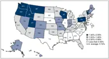 In 2012, Oregon performed a study of all births in the state during the year as a part of discussing a bill regarding licensing requirements for midwives in the state. They found that the rate of intrapartum infant mortality was 0.6 deaths per thousand births for planned hospital births, and 4.8 deaths per thousand for planned home births. They further found that the death rate for planned home births attended by direct-entry midwives was 5.6 per thousand. The study noted that the statistics for Oregon were different for other areas, such as British Columbia, which had different licensing requirements.[44] Oregon was noted by the Centers for Disease Control and Prevention as having the second-highest rate of home births in the nation in 2009, at 1.96% compared to the national average of 0.72%.[45] A 2014 survey of nearly 17,000 voluntarily reported home births in the United States between 2004 and 2010 found an intrapartum infant mortality rate of 1.30 per thousand; early neonatal and late neonatal mortality rates were a further 0.41 and 0.35 per thousand. The survey excluded congenital anomaly-related deaths, as well as births where the mother was transferred to a hospital prior to beginning labor.[40]