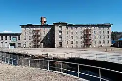 In 1806, the Hope Cotton Factory Company built a textile mill building along the Pawtuxet River, southeast of the site of the Hope Furnace in a settlement that later came to be called Hope Village. The mill was constructed out of wood. Between 1806 and 1844 the mill buildings passed through several hands. In 1844, the mill buildings burned down and the buildings were replaced by a large, four-story gabled roof stone building with a belfry tower on its west face and roof dormers by the Providence firm of Brown and Ives, which had purchased the mill property in 1844. Around 1900, a 40,000 square foot one story brick mill building was added to the south of the stone mill buildings. The gabled roof of the stone mill building was replaced by a flat roof and a fifth floor was added to the original stone mill.[2][3]