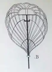A horo was around 1.8 m (6 ft) long and made from several strips of cloth sewn together with a fringe on the top and bottom edges. The cloth strips were sewn together and formed into a sort of bag which would fill with air like a balloon when the wearer was riding a horse.[1] A light framework of wicker, bamboo or whale bone known as an oikago, similar to a crinoline, which is said to have been invented by Hatakeyama Masanaga during the Ōnin War (1467–1477),[2] was sometimes used to keep the horo expanded. Attaching the horo generally involved a combination of fastening cords and possibly a staff. The top cords were attached to either the helmet or cuirass of the wearer while the bottom cords were attached to the waist.[3] The family emblem (mon) of the wearer was marked on the horo.[1]