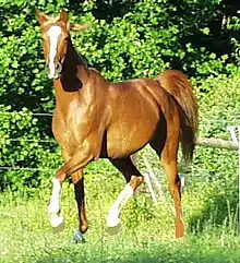 The trot, a two-beat gait involving diagonal pairs of legs. The two legs with white stockings are off the ground.