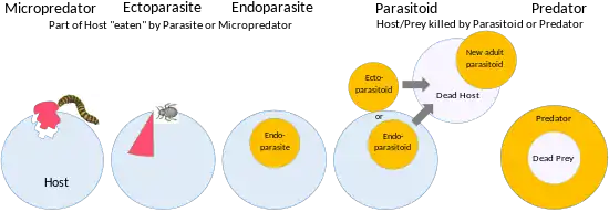 A parasite may have a long-term relationship with its host, as is the case with all endoparasites. The guest seeks out the host and obtains food or another service from it, but does not usually kill it.[6] In contrast, a parasitoid spends a large part of its life within or on a single host, ultimately causing the host's death, with some of the strategies involved verging on predation. Generally, the host is kept alive until the parasitoid is fully grown and ready to pass on to its next life stage.[7] A guest's relationship with its host may be intermittent or temporary, perhaps associated with multiple hosts, making the relationship equivalent to the herbivory of a wild-living animal. Another possibility is that the host–guest relationship may have no permanent physical contact, as in the brood parasitism of the cuckoo.[6]