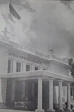 In 1915, members of the Indonesian nationalist organisation Budi Utomo and others toured the Netherlands to argue for the establishment of a legislature for the Dutch East Indies, and in December 1916 a bill was passed to establish a Volksraad (People's Council).[4] It met for the first time in 1918. Ten of its nineteen members elected by local councils were Indonesians, as were five of the nineteen appointed members. However, it had only advisory powers, although the governor-general had to consult it on financial matters. The body grew in size to 60 members, half of who were elected by a total of 2,228 people.[5]