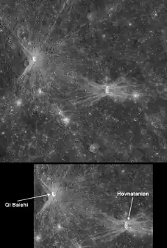 Hovnatanian is a crater on Mercury. Its “butterfly” pattern of ejecta rays were created by an impact at an even lower angle than that which formed neighboring Qi Baishi crater. From the "butterfly" pattern of rays (similar to Messier crater on the Moon), the Hovnatanian impactor was travelling either north-to-south or south-to-north prior to hitting Mercury's surface.[1] Hovnatanian lies to the west of Tir Planitia.