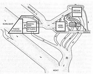 From this view, biogeochemical cycles are driven by radiant energy.[29] Odum expressed the balance between energy input and output as the ratio of production (P) to respiration (R): P-R. He classified water bodies based on their P-R ratios, which separated autotrophic from heterotrophic ecosystems: "[Odum's] measurements of flowing water metabolism were measurements of whole systems. Odum was measuring the community as a system, not adding up the metabolism of the components as Lindeman and many others had done".[30] This reasoning appears to have followed that of Odum's doctoral supervisor, G. E. Hutchinson, who thought that if a community were an organism then it must have a form of metabolism.[31] However, Golley notes that Odum attempted to go beyond the reporting of mere ratios, a move which resulted in the first serious disagreement in systems energetics.
