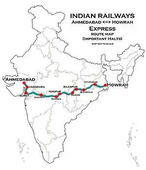 The 12834/33 Howrah–Ahmedabad Superfast Express runs via Kharagpur Junction, Rourkela Junction, Bilaspur Junction, Raipur Junction, Nagpur Junction, Bhusaval Junction, Nandurbar, Surat & Vadodara Junction.