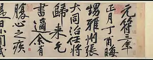 Huang Tingjian (simplified Chinese: 黄庭坚; traditional Chinese: 黃庭堅; Wade–Giles: Huang T'ing-chien; 1045, Jiangxi province, China–1105, Yizhou [now Yishan], Guangxi)[1] was a Chinese calligrapher, painter, and poet of the Song dynasty. He is predominantly known as a calligrapher, and is also admired for his painting and poetry. He was one of the Four Masters of the Song Dynasty (Chinese: 宋四家), and was a younger friend of Su Shi and influenced by his and his friends' practice of literati painting (simplified Chinese: 文人画; traditional Chinese: 文人畫), calligraphy, and poetry; regarded as the founder of the Jiangxi school of poetry.[1]
