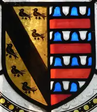 In 1384, Sir Hugh Luttrell married Catherine Beaumont (d. 28 August 1435),[4] a daughter of Sir John Beaumont (d.1379/80)[5] of Shirwell and Saunton in North Devon, MP for Devon 1376–80,[6] a substantial landowner in Devon, by his second wife Joan Crawthorne, granddaughter and heiress of Sir Robert Stockey, MP in 1318, of Crawthorne and Cranstone.[7] Alabaster effigies survive in Dunster Church of himself and his wife, badly mutilated.[8] The arms of Beaumont (Barry of six vair and gules) appear in Dunster Church and on the Luttrell Table Carpet, c.1520, now in the collection of the Burrell Collection in Glasgow, probably made in about 1520 to record the marriage of his descendant Sir Andrew Luttrell (1484–1538) of Dunster and his wife Margaret Wyndham (d.1580). By his wife he had six children: