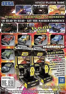 Hummer is an arcade racing game released by Sega in 2009. The game runs on the Sega Lindbergh platform.[1] There are two game modes: Race Mode and Time Attack Mode. In Race Mode, players choose between 3 Hummers, each with an additional variant, to race against 20 opponents.[2][3] Two different variants of the cabinet feature two sets of controls side-by-side. This enables co-op play between players on the same cabinet using the "Driver Change System", which swaps the person controlling the vehicle at checkpoints or after collisions. Consequently, it is possible for up to 8 people to race at the same time, if the maximum of four 2-player machines are linked.[4] The game also features a boost meter, which can grant a speed boost when filled. The boost meter is increased by driving through destructible obstacles and landing controlled jumps.[1]