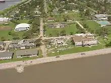 Severe beach erosion occurred from High Island to Freeport, though large geotextiles-tubes reduced the erosion on Galveston Island and the Bolivar Peninsula.[14] The outer bands of the hurricane spawned two tornadoes. One was an F1 on the Fujita scale that caused damage to several buildings in Palacios, and the other damaged homes in Port Lavaca.[1]