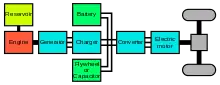 Structure of a series-hybrid vehicle. The grey square represents a differential gear. An alternative arrangement (not shown) is to have electric motors at two or four wheels.