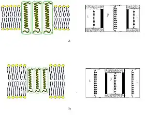 - When the hydrophobic part of a transmembrane protein is too thin to match the hydrophobic bilayer thickness (right part of Figure), again this might result in protein aggregation, or changes in backbone conformation and/or side chain orientation. Too short peptides may adopt a surface localization. Lipids could decrease the local bilayer thickness by disordering their acyl chains.