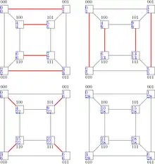 -dimensional hypercube is a network topology for parallel computers with processing elements. The topology allows for an efficient implementation of some basic communication primitives such as Broadcast, All-Reduce, and Prefix sum.[1] The processing elements are numbered through . Each processing element is adjacent to processing elements whose numbers differ in one and only one bit. The algorithms described in this page utilize this structure efficiently.