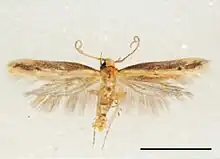 The length of the forewings is 5 millimetres (0.20 in) for males and 5.8 millimetres (0.23 in) for females. Adults have a forewing pattern that differs from any other described species in the genus Hyposmocoma. It consists of a wide pale yellow band along the anal margin of the forewing, curving proximally at the wing margin towards the costa. There is a small, round, dark brown mark present approximately two thirds of the way from the wing base to the apex.[1]