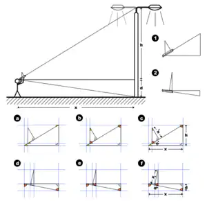 An example of such a scale hypsometer is illustrated here, and can be seen to consist of a sighting tube, a fixed horizontal scale, and an adjustable vertical scale with attached plumb line. The principle of operation of such a scale hypsometer is based on the idea of similar triangles in geometry. First the adjustable vertical scale is set at a suitable height. Then as in step 1 in the illustration, a sighting is taken on the top of the object whose height is to be determined, and the reading on the horizontal scale, h', recorded. Calculation from this value will eventually give the height h, from the eye-line of the observer to the top of the object whose height is to be determined. Similarly as in step 2 of the illustration, a sighting is taken on the base of the object whose height is to be determined, and the reading on the horizontal scale, d', recorded. Calculation from this value will eventually give the distance from the base of the object to the eye-line of the observer. Finally the distance x from the observer to the object needs to be measured.