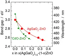 Similarly to CuGaO2, α-AgGaO2 and α-AgAlO2 have the delafossite crystal structure while the structure of the corresponding β phases is similar to wurtzite (space group Pna2a). β-AgGaO2 is metastable and can be synthesized by ion exchange with a β-NaGaO2 precursor. The bandgaps of β-AgGaO2 and β-AgAlO2 (2.2 and 2.8 eV respectively) are indirect; they fall into the visible range and can be tuned by alloying with ZnO. For this reason, both materials are hardly suitable for solar cells, but have potential applications in photocatalysis.[3]
