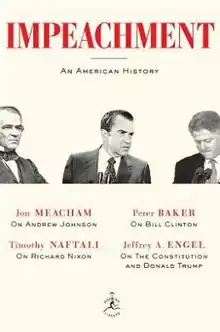 Impeachment: An American History is a 2018 book by Jon Meacham, Timothy Naftali, Peter Baker, and Jeffrey A. Engel, published by Modern Library. Meacham, Naftali, and Baker describe the impeachments (or in the case of Nixon, unfinished impeachment proceedings) of Andrew Johnson, Richard Nixon, and Bill Clinton, respectively. Engel writes about the concept of impeachment and the likelihood of Donald Trump being impeached.[1]