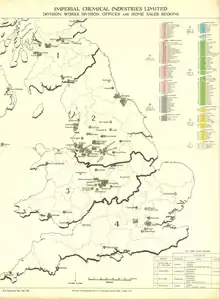 Map showing Imperial Chemical Industries sales regions, offices and factories in the United Kingdom in May 1955
