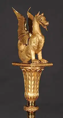 At the top, a gold wyvern is shown with its tail up, mouth open, forked tongue and eyes made of diamonds.