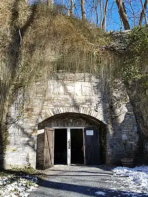 The entrance to the cavern system that is used by modern visitors is located in a bluff along the Swatara Creek.[28] A second entrance that had been previously used by visitors was sealed for security purposes during the late 1920s.