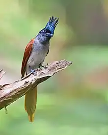 The Indian paradise flycatcher (Terpsiphone paradisi) is a medium-sized passerine bird native to Asia, where it is widely distributed. As the global population is considered stable, it has been listed as Least Concern on the IUCN Red List since 2004. It is native to the Indian subcontinent, Central Asia and Myanmar.[1]