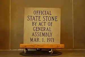 Indiana state stone is a public sculpture at the Indiana Statehouse in downtown Indianapolis. It is an 85-pound (39 kg) cube of Indiana limestone that is mounted on a wooden, rotating dolly.[1] It was carved from limestone quarried from the P. M. & B. limestone quarry located in southern Indiana. This sculpture commemorates limestone becoming Indiana's official state stone on March 1, 1971.