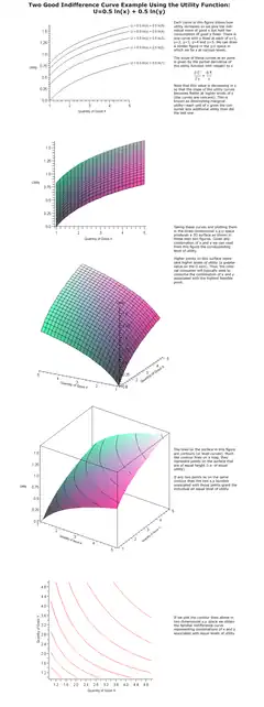 In economics, an indifference curve connects points on a graph representing different quantities of two goods, points between which a consumer is indifferent. That is, any combinations of two products indicated by the curve will provide the consumer with equal levels of utility, and the consumer has no preference for one combination or bundle of goods over a different combination on the same curve. One can also refer to each point on the indifference curve as rendering the same level of utility (satisfaction) for the consumer. In other words, an indifference curve is the locus of various points showing different combinations of two goods providing equal utility to the consumer. Utility is then a device to represent preferences rather than something from which preferences come.[1] The main use of indifference curves is in the representation of potentially observable demand patterns for individual consumers over commodity bundles.[2]