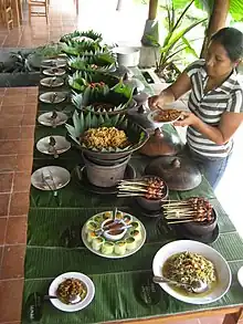 Rice has been an essential staple for Indonesian society, as bas-reliefs of 9th century Borobudur and Prambanan describes rice farming in ancient Java. Ancient dishes were mentioned in many Javanese inscriptions and historians have succeeded in deciphering some of them. The inscriptions from Kingdom of Mataram era circa 8th to 10th century mentioned several ancient dishes, among others are hadaŋan haraŋ (minced water buffalo meat satay, similar with today Balinese sate lilit), hadaŋan madura (water buffalo meat simmered with sweet palm sugar), and dundu puyengan (eel seasoned with lemon basil). Also various haraŋ-haraŋ (grilled meats) either celeṅ/wök (pork), hadahan/kbo (water buffalo), kidaŋ/knas (deer) or wḍus (goat).[16] Ancient beverages include nalaka rasa (sugarcane juice), jati wangi (jasmine beverage), and kinca (tamarind juice). Also various kuluban (boiled vegetables served in spices, similar with today urap) and phalamula (boiled yams and tubers served with liquid palm sugar).[17] Other ancient vegetable dishes include rumwah-rumwah (lalap), dudutan (raw vegetables) and tetis.[18]