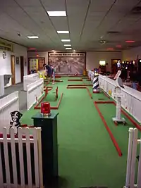 Indoor golf is an umbrella term for all activities in golf which can be carried out indoors. Venues include indoor driving ranges, chipping areas, putting greens, machines and home golf simulators. Many of these indoor facilities are businesses that include additional entertainment options as well as food and drink for customers.