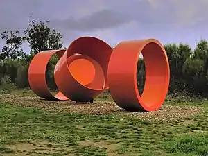 This work was installed in 1980, on a small lawn outside the Union Building at the heart of the University of Melbourne.[51] It is formed from 19mm steel, and consists of two upright steel circles, each 360 cm in diameter, and three folded metal planes; the total length is 6 metres.[52] It provides the students with a unique resting place among its massive unfurling bands and is the focal point of one of the university's busiest outdoor spaces, the Union Lawn.[53] see more images
