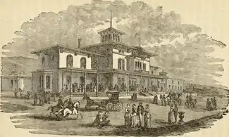 Completed in 1868, the hotel cost Mr. Davis a total of $162,000 (approximated $3.6 million in 2016 US Dollars), and opened on July 4. On July 21, 1871, the hotel hosted the first college rowing regatta in the United States held by the Rowing Association of American Colleges, one of the country's earliest intercollegiate undergraduate sporting events. Held on the banks of the Connecticut River, Massachusetts Agricultural College won the event in an upset against the teams of Harvard, Yale, and Brown.[10] This would be one of the only significant events in the resorts history however, as following the Panic of 1873, it would be sold at auction to one N.S. Chandler "for a little less than $30,000".[8] The hotel, which featured a farm, telegram station, gasworks, and railway stop, was short-lived however, and closed in the winter of 1874 due to low attendance in the midst of an economic depression.[11] The hotel was razed by fire on July 25, 1875, with some indication that the blaze "was the work of an incendiary".[12][13] The hotel and its contents were insured in total for $20,000.[14] Though the hotel itself stood on the shores of the Connecticut for less than a decade, the Ingleside name would persist as that of the surrounding area long after its absence.[15]