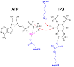 Evidence for this exquisite specificity and for the catalytic mechanism was found when the apo-enzyme, substrate-bound complex, and product-bound complex X-ray crystal structures of ITPKA were determined.[10][11] The figure to the right depicts the catalytic mechanism, whereby the 3'OH of IP3 attacks the gamma-phosphate of ATP, and amino acid residues of ITPK important for stabilizing the substrates and products in the active site.