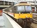 The first production Advanced Passenger Train was unveiled on 7 June 1978. It was painted in a new livery with dark grey upper body and light grey lower body separated by wide white and red bands. The roof was white to reduce solar heating, and a large 'InterCity APT' logotype was positioned on the dark grey section of the power cars – 'InterCity' had no hyphen and was solid white but the 'APT' was an outline.[9] A new 'Executive' service was part of the relaunch of the InterCity Sector on 3 October 1983. This saw the coaches of the Manchester Pullman and two HSTs refurbished and repainted experimentally into the same colour scheme as the APT. The HSTs continued to carry an outline 'InterCity 125' logotype (now with no hyphen) and the large yellow area on the power car that had been a feature of the blue and grey livery. The logotype on coaches was positioned as before but changed to black.[10] By May 1984 other coaches and locomotives were entering service in the dark and light grey livery. 87012 Coeur de Lion entered service with black numbers on the cab side but no logo. 73123 Gatwick Express had white numbers and a large double arrow logo on the dark grey of its bodyside, although the new Gatwick Express service was not operated by the InterCity Sector.[11] In use there were problems with the light colour showing dirt on the diesel HSTs and so dark grey was extended from the roof to cover louvres near the top of the power car body, and the logotype was changed from an outline to solid white to make it more striking.[12] The use of the term 'Executive' was dropped in 1985 and the livery was then referred to as just 'InterCity'.[7]
